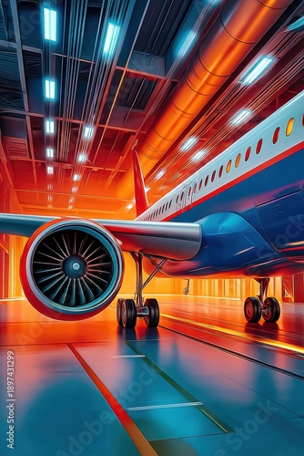 Fototapeta premium Sleek jet in a neon-lit hangar with blue and red lighting and shining landing...