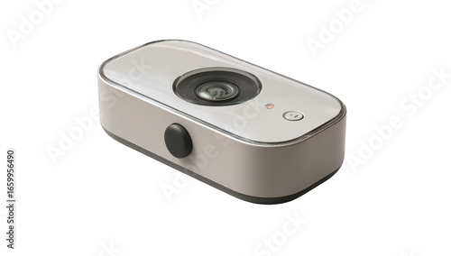 © Tamba, Fototapeta premium Sleek, light-colored camera with lens, buttons, and indicator light on black