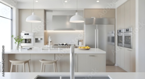 Fototapeta premium Sleek Light-Toned Kitchen Design, Modern Kitchen Island with Stools, Double...
