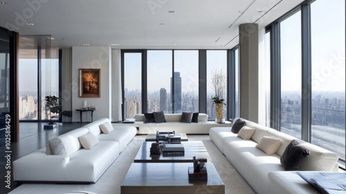 Fototapeta premium Sleek living room with minimalist furniture, monochromatic palette, and floor-to-ceiling windows. Sophisticated and elegant