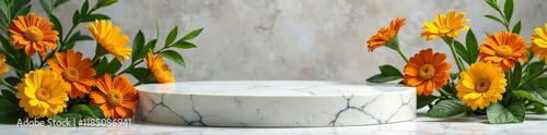 © Pawarit, Fototapeta premium Sleek marble podium with natural calendula arrangement, cosmetics showcase, natural products, elegance