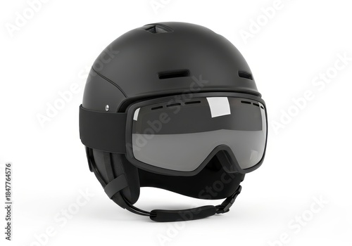 © twilight mist, Fototapeta premium Sleek matte black winter sports helmet paired with protective eyewear is isolated on white