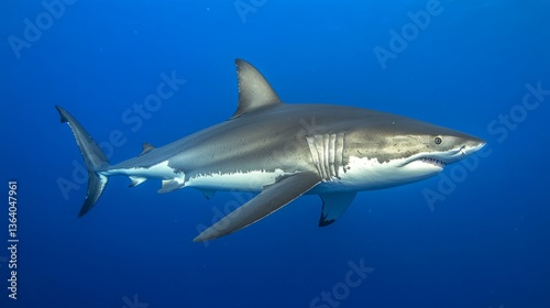 Fototapeta premium Sleek megalodon glides through deep waters, contrasting with a bulky...