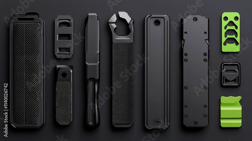 © Cdel, Obraz premium Sleek Metallic Tool Storage, modern matte black and brushed metal tools, designed for functionality and style, perfect for organized workspaces and contemporary decor