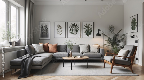 Fototapeta premium Sleek minimalist Scandinavian living room with a neutral gray couch and...