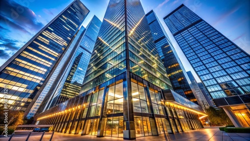 © Wanlop, Naklejka premium Sleek, mirrored skyscraper with angular lines, gleaming glass facade, and modern LED lighting, exuding luxury and corporate sophistication.