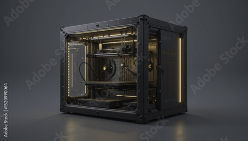 © Pattrisa, Obraz premium sleek, modern 3D printer encased in transparent, illuminated box, showcasing its intricate components and design. ambient lighting highlights machine advanced technology and precision