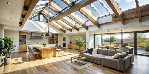 Obraz premium Sleek modern flat house with angular skylights, wooden beams and minimalist decor, sleek building design, open-plan layout