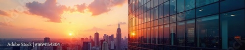 Fototapeta premium Sleek modern glass facade office building reflecting the city skyline at sunset Perfect for corporate branding, architecture, and real estate marketing , night, sunset