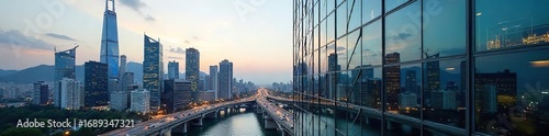 © Chatthorn, Naklejka premium Sleek modern glass office building in a vibrant downtown cityscape, reflecting the city skyline Ideal for corporate, real estate, and urban development imagery , sun, metropolis
