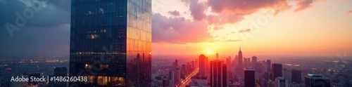 Fototapeta premium Sleek modern glass skyscraper office building reflecting the city skyline at sunset Perfect for corporate, real estate, and architecture projects , geometric, contemporary