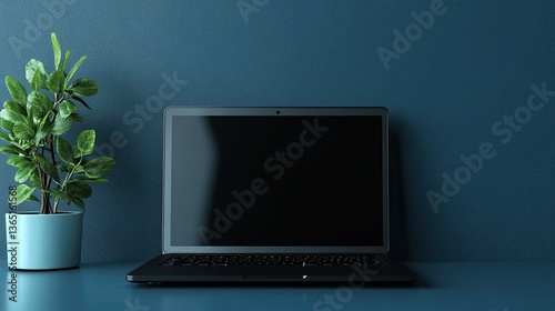 © Ali Khan, Fototapeta premium Sleek Modern Laptop on Minimalist Blue Platform: Black Screen Resting on Stylish Tech Surface