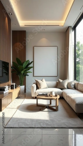 Fototapeta premium Sleek modern living room, neutral palette, abundant natural light, clean...