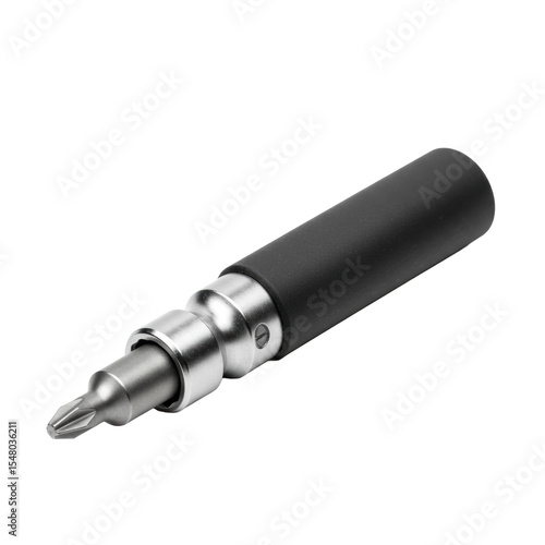 Fototapeta premium Sleek, modern magnetic bit holder of brushed chrome metal with black rubberized grip, subtly holding a silver Phillips head bit, isolated on a pristine transparent studio background, concept of