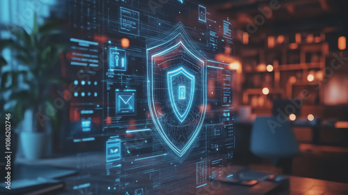 Obraz premium Sleek Modern Office Space Featuring Futuristic Digital Security Interface with Interactive Elements for Enhanced Technology and Safety in Work Environment