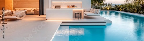 Fototapeta premium Sleek outdoor kitchen with a swim-up bar and floating seating area, luxury resort feel