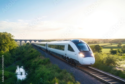 Naklejka premium sleek passenger train glides smoothly along sunlit countryside railway track...