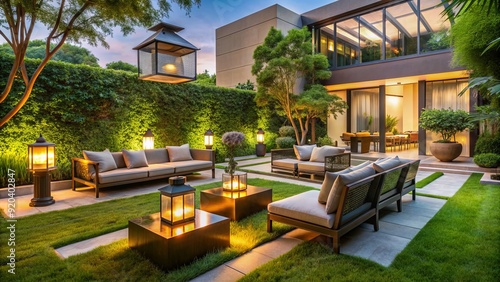 Fototapeta premium Sleek patio furniture and lanterns adorn a lush green lawn surrounded by...