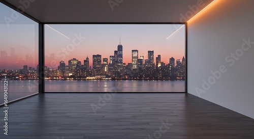 © Daxxt, Obraz premium Sleek Penthouse Corner Window Framing the Manhattan Skyline at Twilight