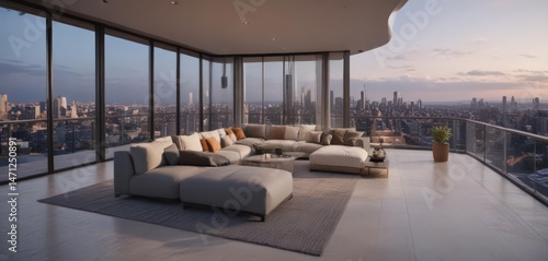 Fototapeta premium Sleek penthouse, panoramic city vista, modern design, bright, suite