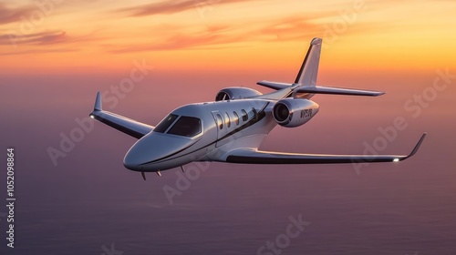 © apichat, Fototapeta premium Sleek Private Jet Flying at Sunset Over the Ocean