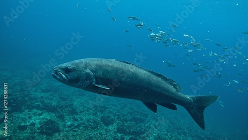 © Ruben, Fototapeta premium Sleek sea bass swimming with smaller fish in clear ocean waters
