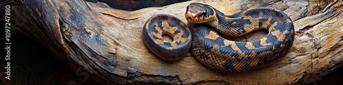 © Lila Patel, Obraz premium Sleek Serpent: A close-up of a snake, elegantly curled around a wooden log.