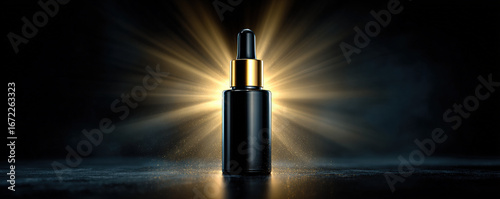 © Liffer, Fototapeta premium Sleek serum bottle stands prominently against dark background, illuminated by radiant glow that highlights its elegant design. dropper cap adds touch of sophistication, creating captivating visual