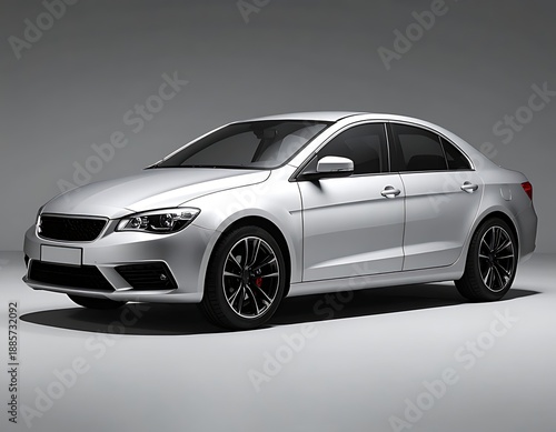 © yogiandrias, Fototapeta premium Sleek silver sedan with black rims parked in studio setting.