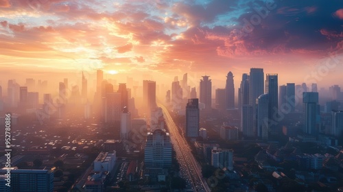 © Bijac, Fototapeta premium sleek skyscraper cityscape at golden hour with an empty road leading to the heart of the metropolis surrounded by a hazy warm glow