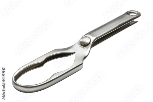 © BANO'S, Obraz premium Sleek stainless steel bottle opener resting on a smooth surface with light reflections isolated on transparent background