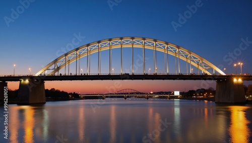 Naklejka premium Sleek steel arches of Hoan Bridge illuminate at dusk over the Milwaukee River with soft LED light reflections on the waters surface