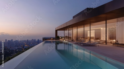 © Cheetose, Obraz premium Sleek Urban Living: Modern Condominium with Rooftop Pool in Vibrant Cityscape