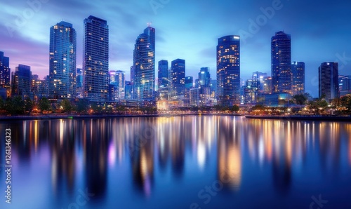 Fototapeta premium Sleek urban skyline at night, with glowing skyscrapers reflecting in a calm river below, showcasing modern city life.