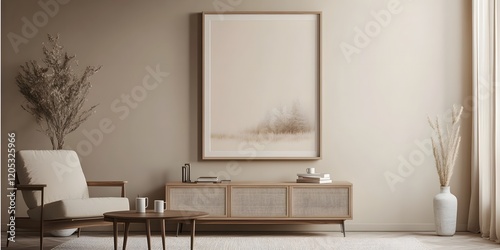 Fototapeta premium Sleek Walnut Media Console with Retro Hairpin Legs in Elegant Living Room Decor