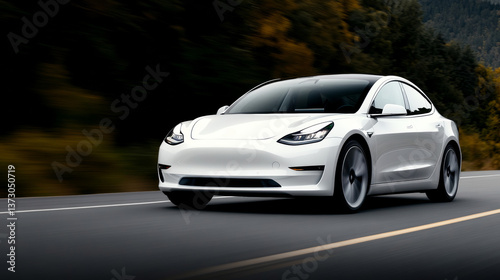 © MonCollection, Fototapeta premium sleek white electric car driving on scenic road