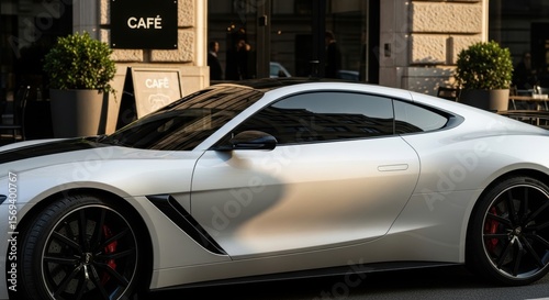 © Oleksandr, Fototapeta premium Sleek white sports car parked outside modern café on city street