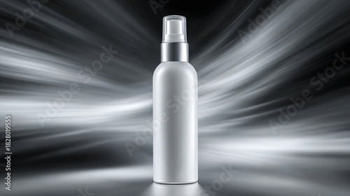 © Екатерина Чумаченко, Fototapeta premium Sleek white spray bottle on an abstract silver backdrop, ideal for cosmetics, skincare, or personal care products. Minimalist aesthetic.