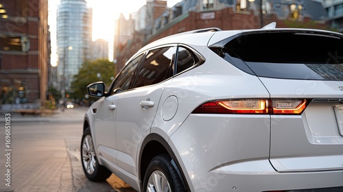© lililia, Fototapeta premium Sleek white SUV captured from behind in a bustling urban area, sunlight reflecting off its red taillights and polished surface