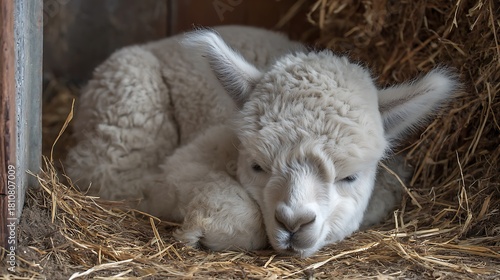 Obraz premium Sleeping Alpaca Cub in Hay Indoor Animal Portrait Close-up