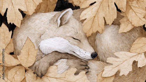 © ekarat, Fototapeta premium Sleeping Baby Fox Watercolor Illustration, Cute Fox Cub Curled Up with Autumn Leaves