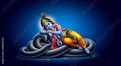 Obraz premium Sleeping Blue Krishna on a Serpent with Peacock Feather Against Blue Background