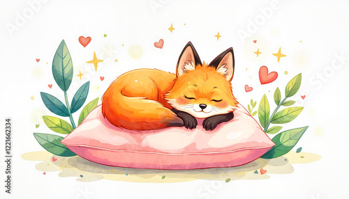 © Anastasiia, Obraz premium Sleeping fox on a pink pillow surrounded by green leaves