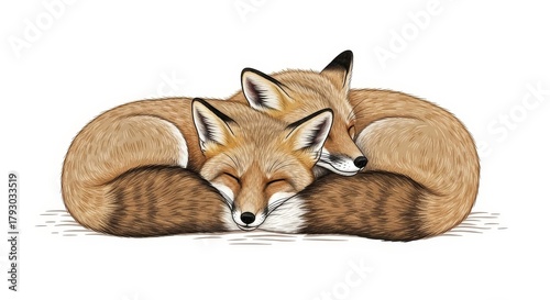 © Nima, Obraz premium Sleeping Foxes Cuddled Together - Two foxes are snuggled up together, peacefully sleeping. The is an illustration on a white background
