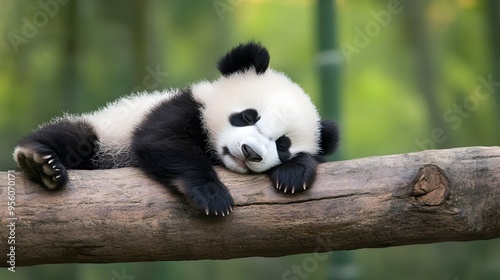 © ChrisTYCat, Fototapeta premium Sleeping Panda Cub Resting on Log in Tranquil Bamboo Forest Setting
