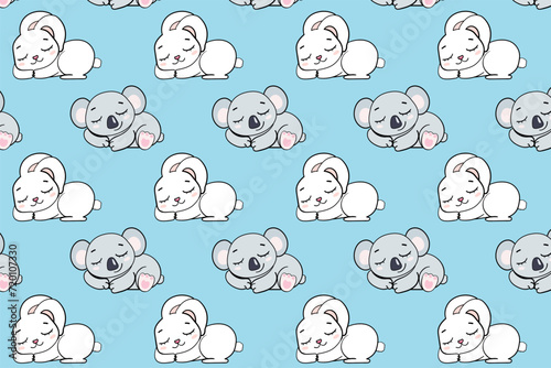 Fototapeta premium sleeping rabbit koala on blue background for boys seamless endless pattern...