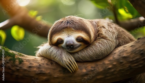 © netsay, Fototapeta premium Sleeping Sloth in Lush Green Rainforest Canopy, Capturing Tranquility and Peace with its Adorable Bearing
