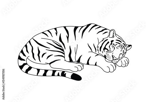 © CreativeDesign, Naklejka premium Sleeping tiger drawing. It is a black and white outline image of a tiger peacefully sleeping or resting, showcasing its relaxed form with stripes. Vector sketch line art draw.