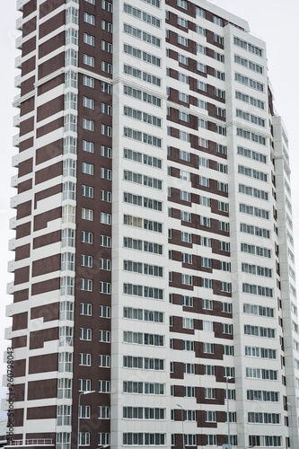 Fototapeta premium Sleeping urban area. Multi-storey residential building with white and brown...