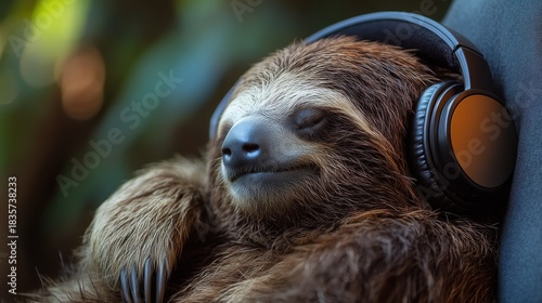 © Aisha, Naklejka premium Sleepy but happy sloth with music headphones